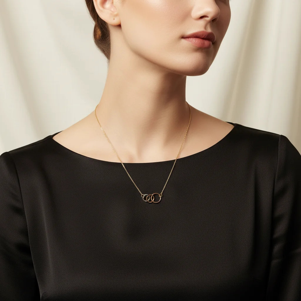 Zlatá retiazka s 3 kruhmi väčší, menší najmenší v troch farbách zlata.