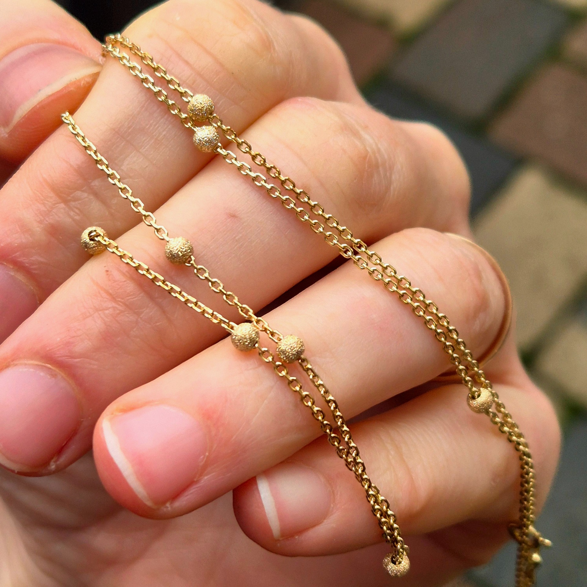 Zlatá retiazka s ligotavými guličkami.