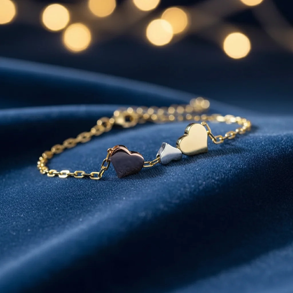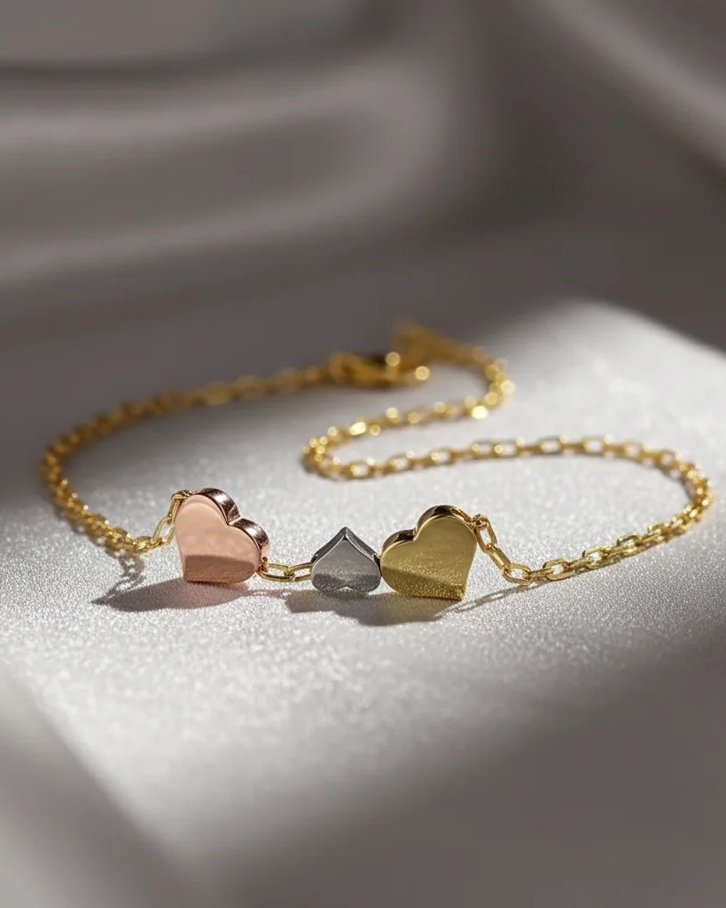 Zlatá retiazka so srdiečkami v troch farbách zlata.