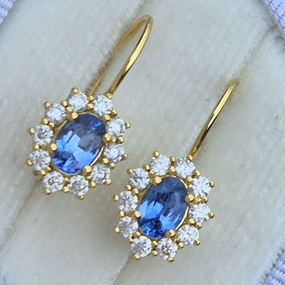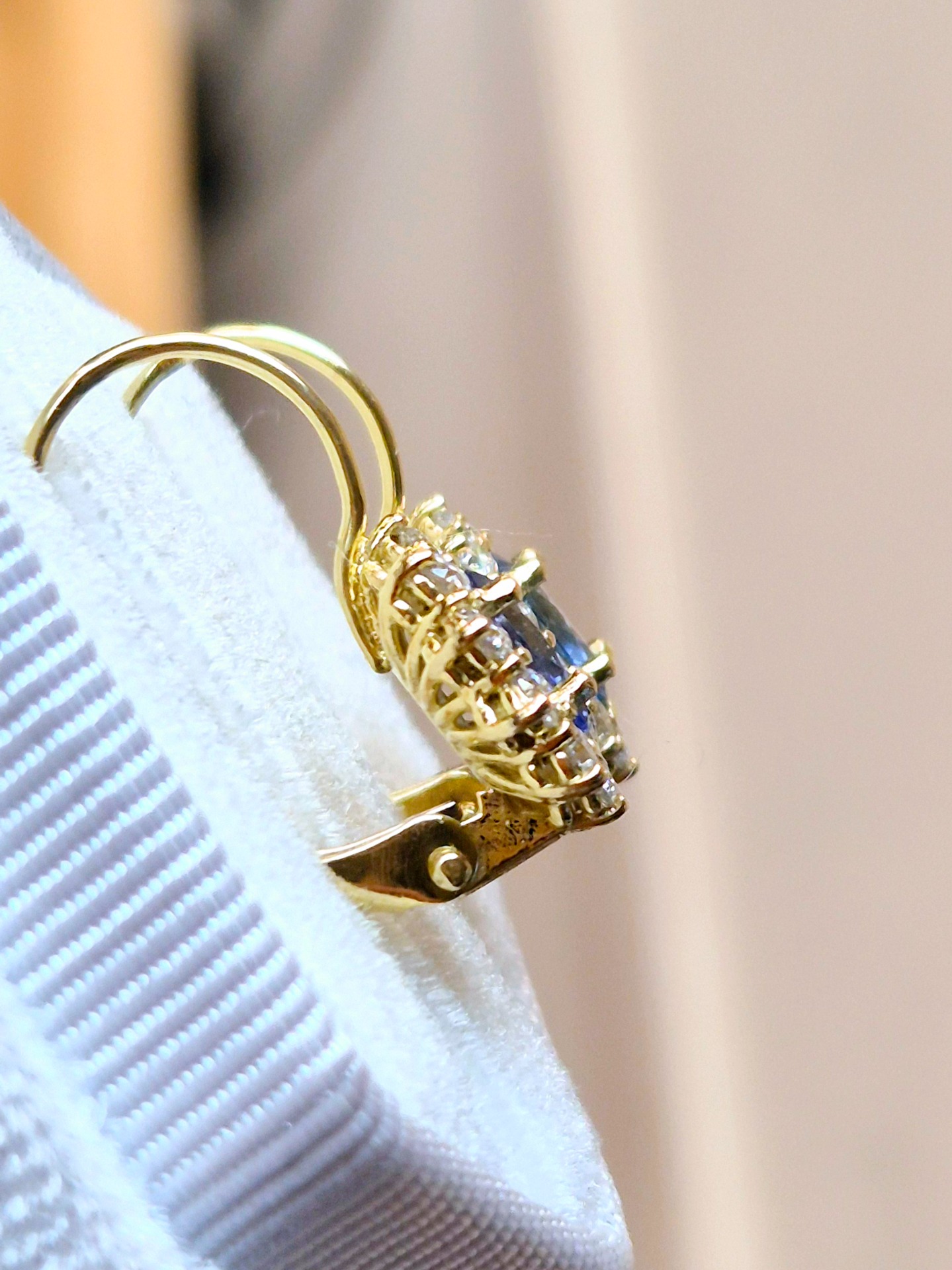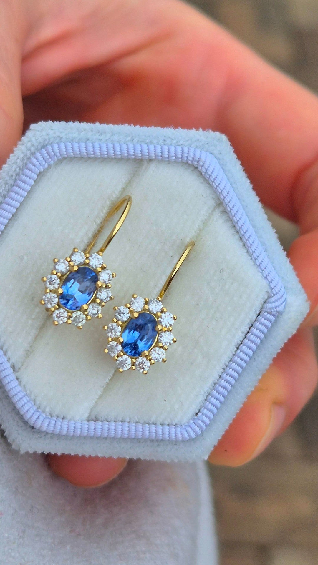 Zlaté náušnice s modrým zafírom.Veľkosť kameňa 5x4mm. Okolo sú moisanity veľkosti 2mm 10ks.