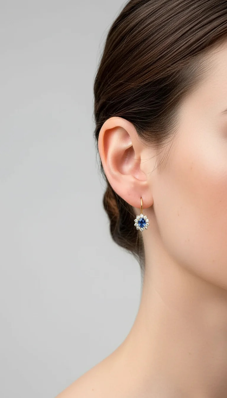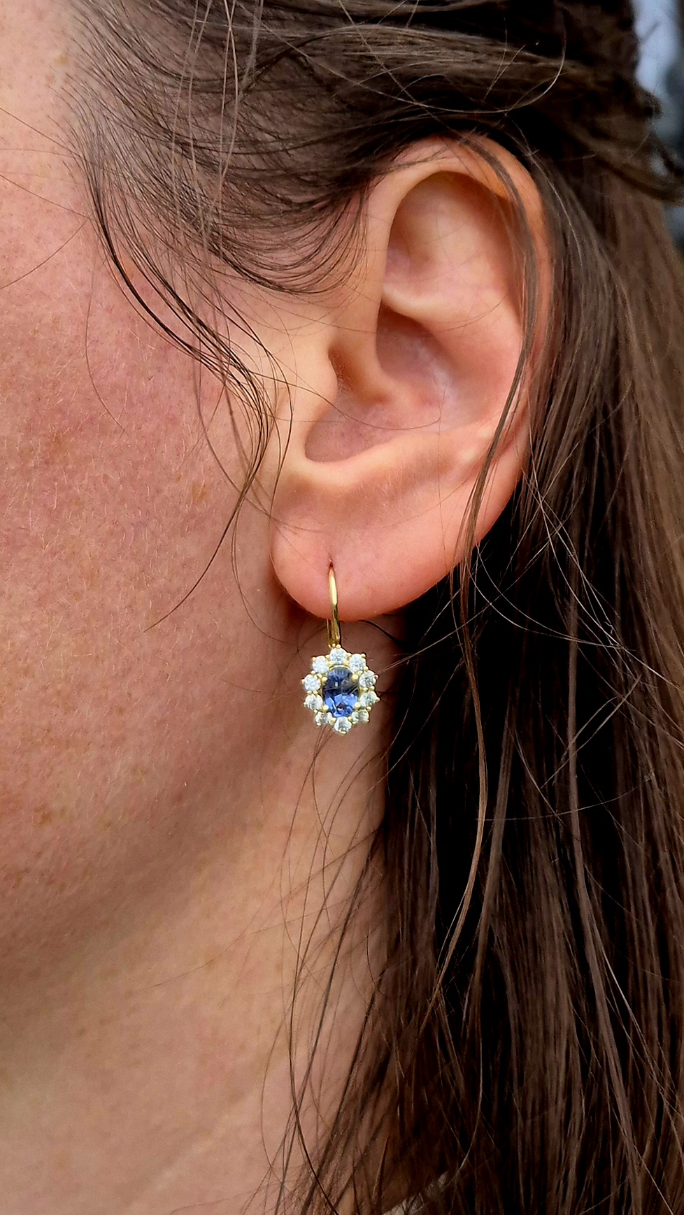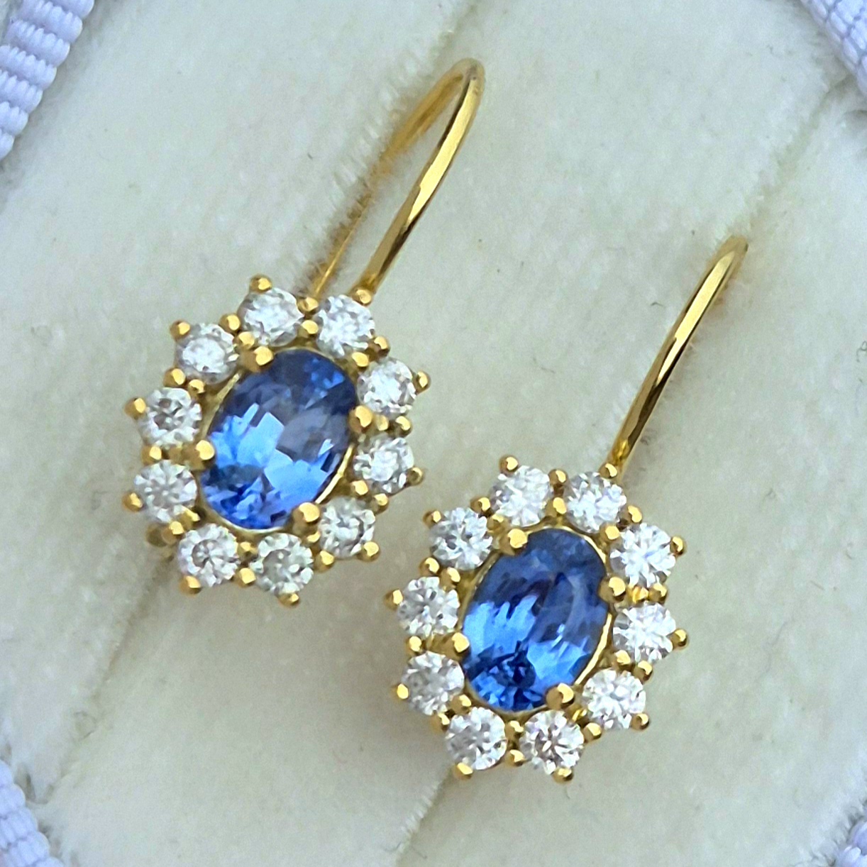 Zlaté náušnice s modrým zafírom.Veľkosť kameňa 5x4mm. Okolo sú moisanity veľkosti 2mm 10ks.