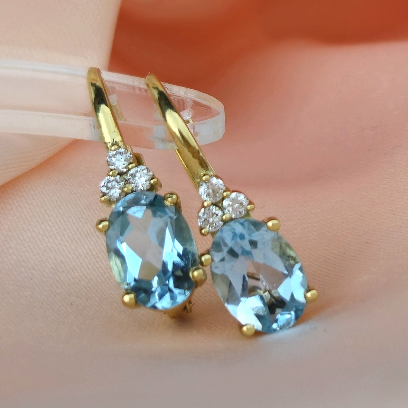 Zlaté náušničky s jemnemodrým drahokamom Akvamarín veľkosti 7x5mm. a diamantami 1,5mm.