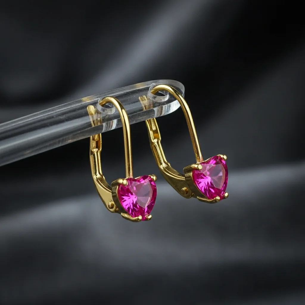 Zlaté náušnice s ružovým Rubínom v tvare srdiečka.